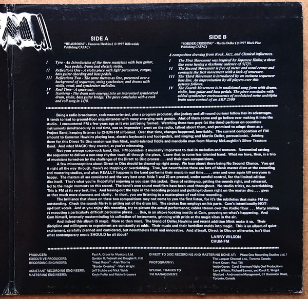 Direct-to-disc recording and mastering done at Phase One Recording Studios Ltd. / The Lacquer Channel Ltd., Toronto Canada.